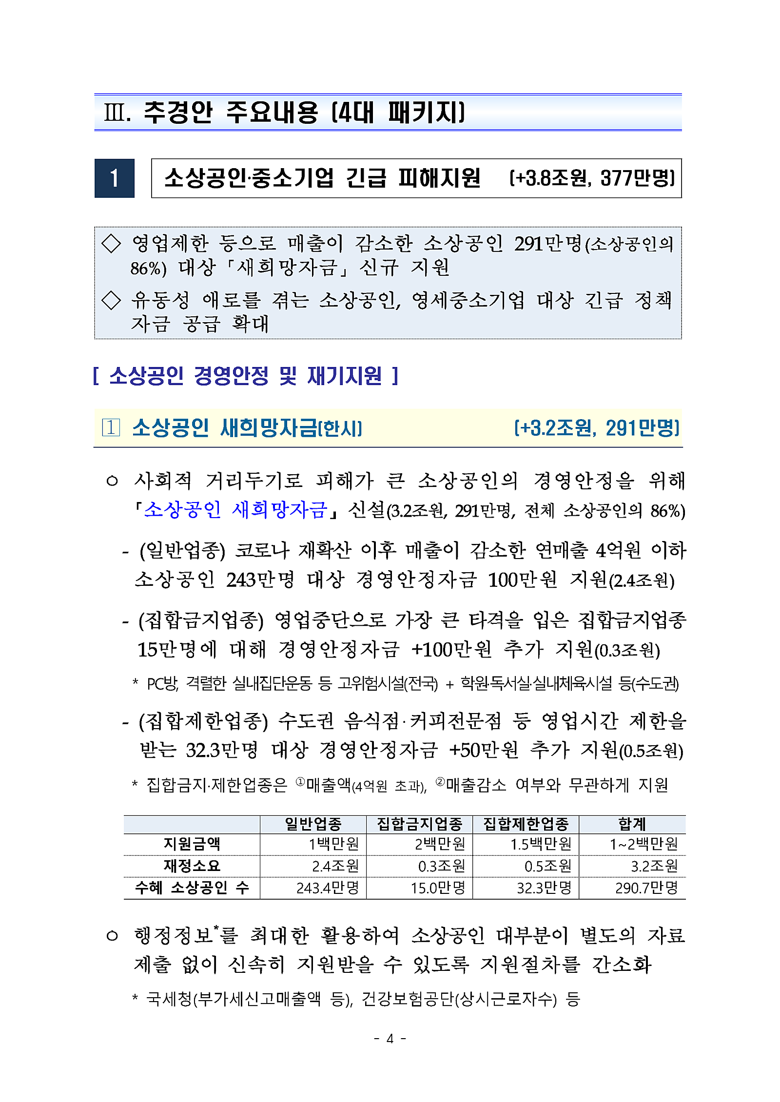 추경안 규모는 총 7.8조원이고 소상공인 중소기업 긴급 피해지원 패키지는 3.8조원, 긴급 고용안정 패키지 1.4조원, 저소득층 긴급 생계지원 패키지 0.4조원, 긴급돌봄 지원 패키지 2.2조원으로 나누어 지급한다고 합니다.