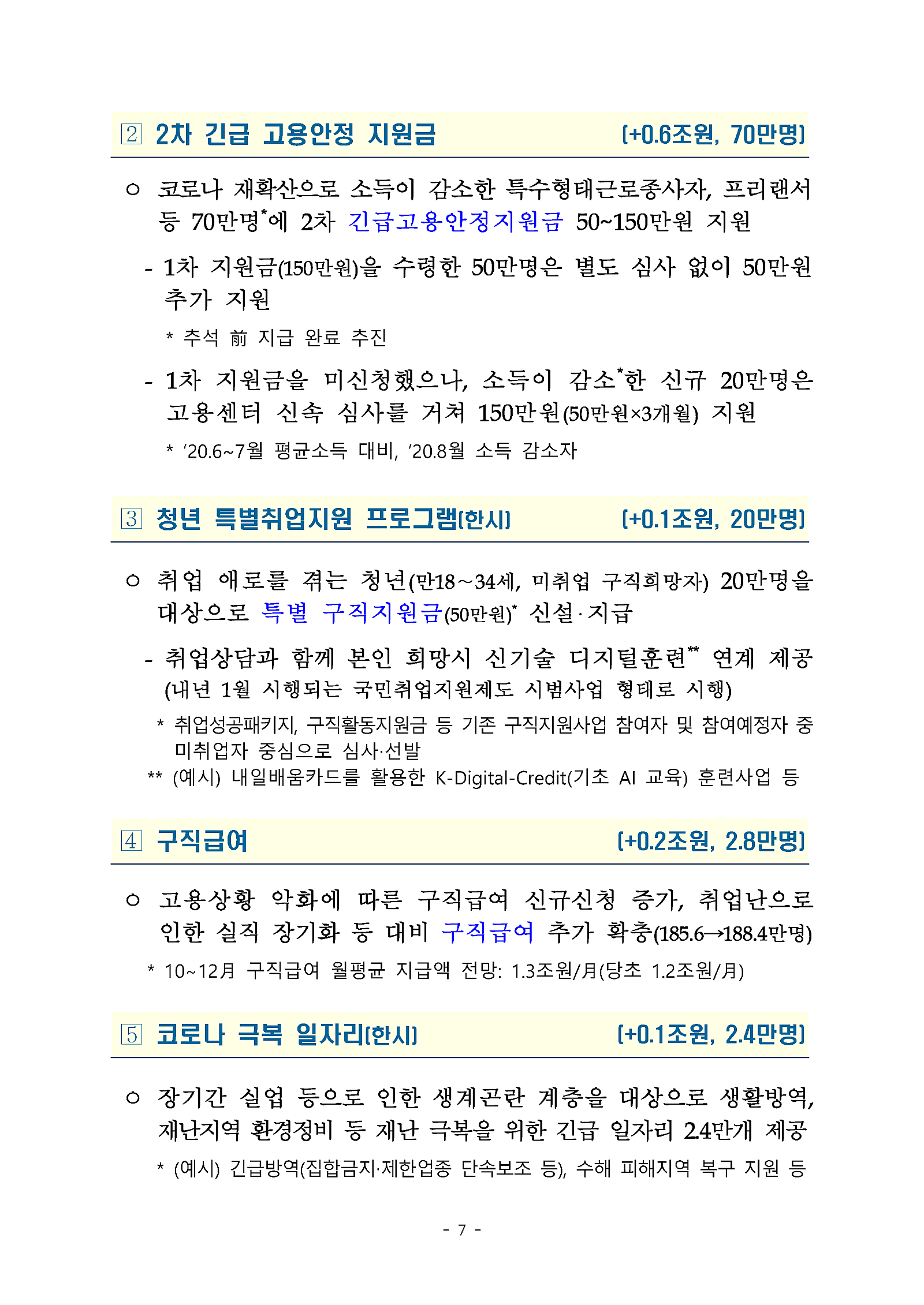 위 내용을 보면 고용 취약 계층 지원에 대한 내용이 기획재정부에서 위 사진과 같이 발표하였습니다. 임금근로자 2047명대상으로 고용유지지원금, 가족돌봄휴가 긴급 비용지원, 유연근무제 간접노무비 지원, 실업자 86만명을 대상으로 구직급여, 청년특별 구직지원금, 코로나 극복 일자리를 지원합니다. 또한 특수형태 근로종사자와 프리랜서를 대상으로 2차 긴급고용 안정지원금 프로그램을 실행합니다.