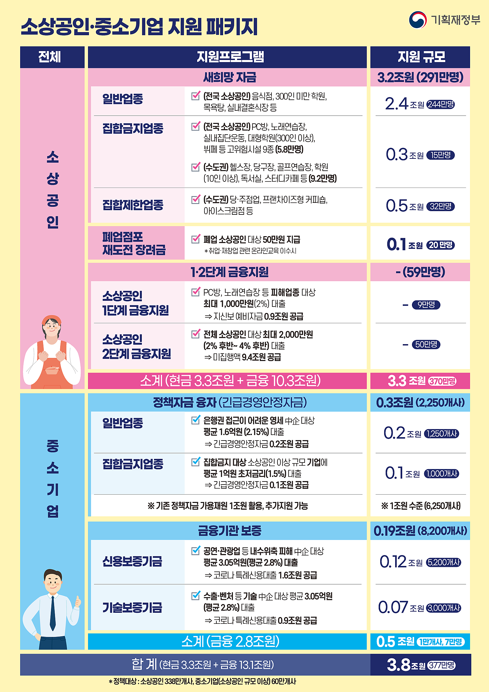 또한 소공상인을 위한 프로그램이 마련되어 있습니다. 소상공인을 위해 새희망 자금(일반업종, 집함금지업종, 집합제한업종, 폐업점포 재도전 장려금)과 1,2단계 금융지원을 실시합니다. 1단계로 PC방이나 노래방, 노래연습장 등 피해업종을 대상으로 최대 1,000만원(2%)을 대출해 줍니다. 2단계로는 최대 2,000만원을 대출해 주는 프로그램이 마련되어 있습니다.